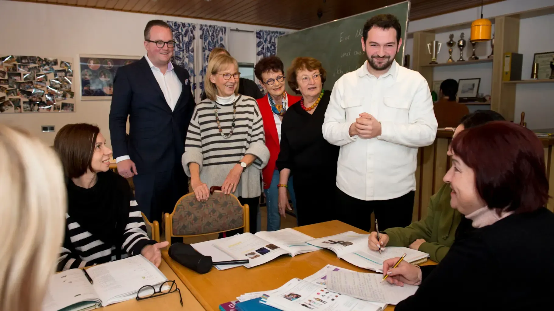 Das Bild zeigt Nicolas Fromm (links) und Hanna Fromm-Bruns (Mitte) als Vertreter der Fromm-Stiftung und zu Besuch beim Sprachkurs des Solidarischen Osnabrück. Die Stiftung unterstützt den Verein mit 20.000 Euro und trägt damit dazu bei, dass der Deutschunterricht stattfinden kann. Auch Lilly Hugenberg und Mechthild Dierks sind auf dem Bild zu sehen zusammen mit Steven Stahlberger, der den Unterricht an diesem Tag leitet. Die Kursteilnehmer*innen zeigen Freude am Unterricht und am Miteinander. Der Verein zeigt sich sehr dankbar für die Unterstützung durch die Fromm-Stiftung.